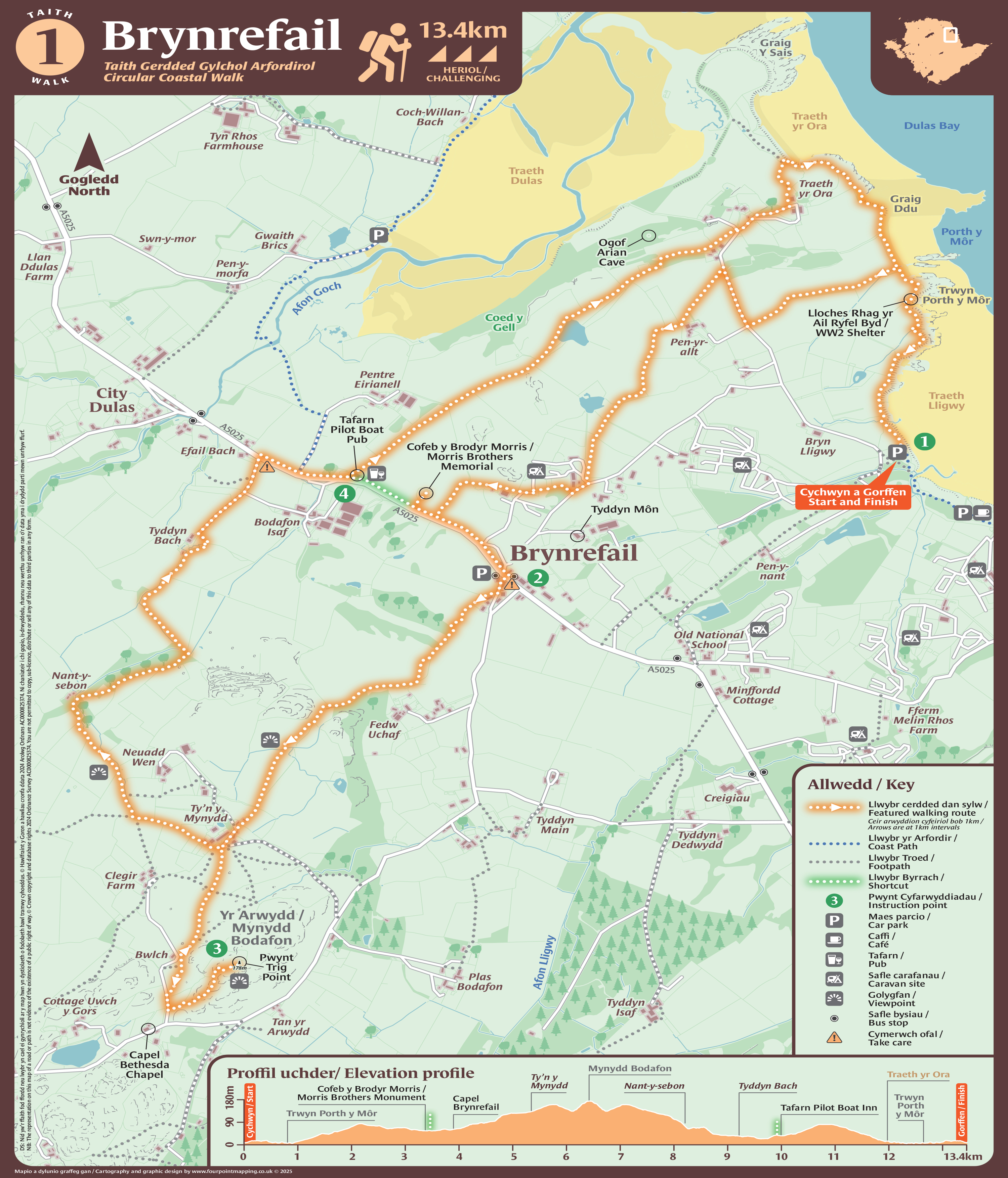 Disgrifiad o daith gylchol ger Brynrefail, ar arfordir dwyreiniol Ynys Môn.