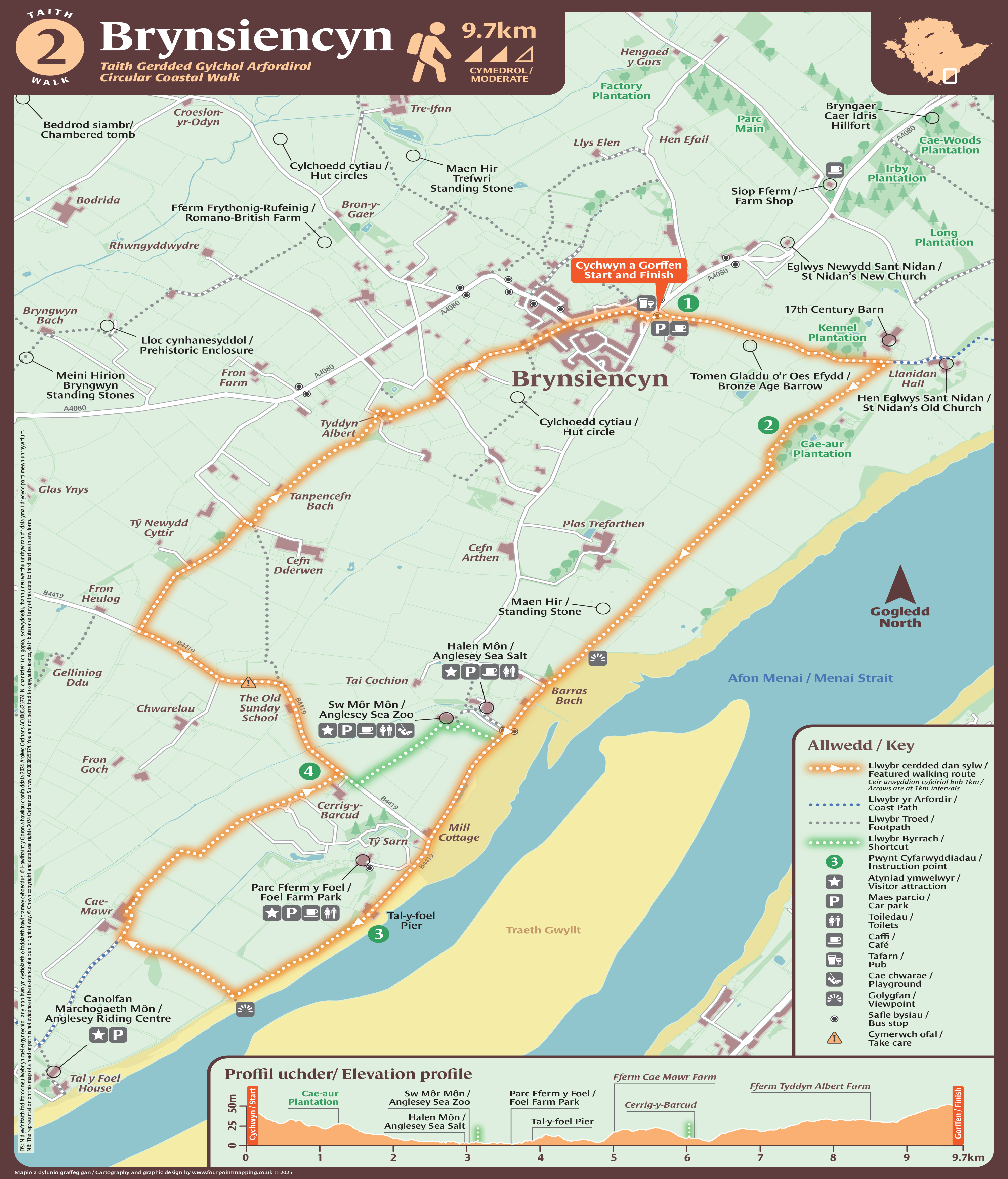 Mae pobl wedi gadael eu hôl ar y gornel hon o Ynys Môn ers miloedd o flynyddoedd: o aneddiadau o Oes y Cerrig, i ffoleddau Fictoraidd. Llwybr hawdd ar draws tir fferm a’r traethlin, ond gall y pellter fod yn her i rai.