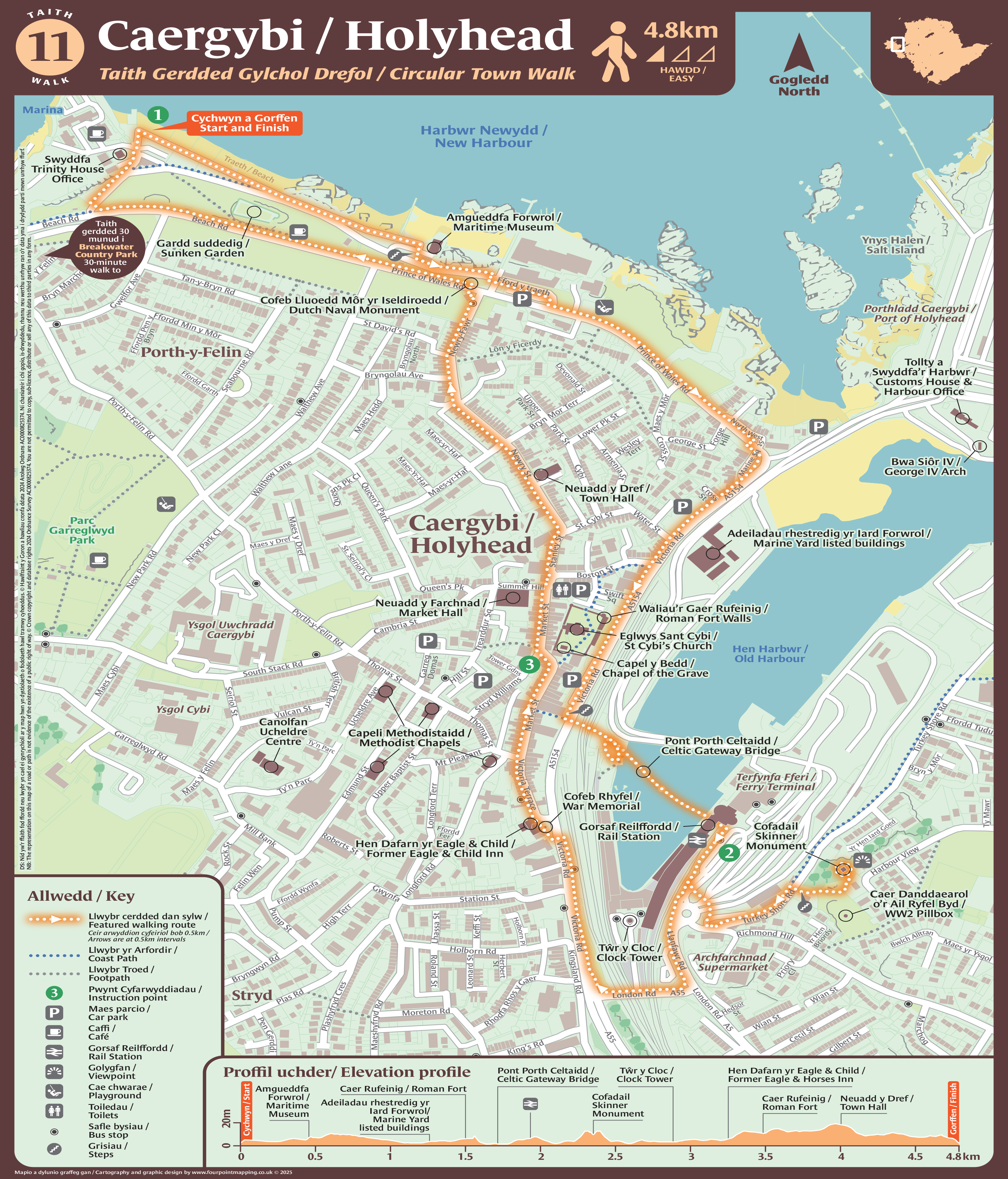 Disgrifiad o daith gylchol yn Caergybi, ar arfordir gorllewin Ynys Môn.
