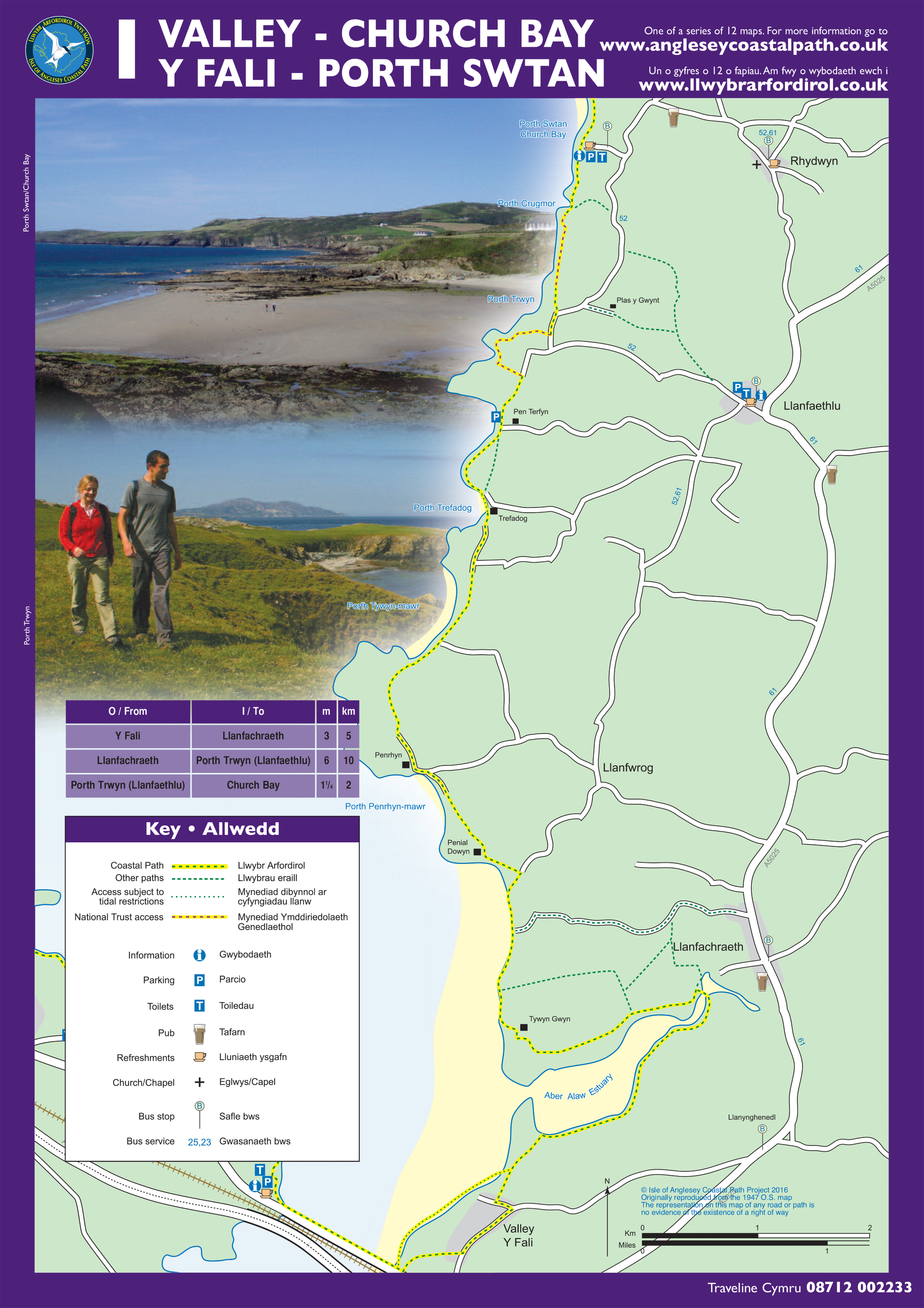 Cerddwch ar draws y traeth, heibio’r bwthyn o’r enw ‘Wavecrest’, ac wrth ddynesu tuag at y tŷ o’r enw Penrhyn Bach, ewch i’r dde i fyny dau ris wrth giât. Dilynwch lwybr caeedig y tu ôl i’r tŷ. Croeswch drac, a chariwch ymlaen ar hyd trac caeedig i ddod allan drwy giât ar lannau’r Afon Alaw.Yma, dilynwch lwybr ar hyd glannau’r afon (dylai’r Afon Alaw fod ar y chwith i chi). Ar ôl oddeutu 2 gilomedr; fe ddowch at bont 35m dros yr afon.Ewch dros y bont o flaen Neuadd Wen a throwch i’r chwith drwy giât mochyn. Cerddwch ar hyd glannau’r afon , ewch drwy giât gan ddilyn y gwrychyn sydd ar y dde i chi ar draws cae. Ewch drwy giât arall i ailymuno â glannau’r afon.