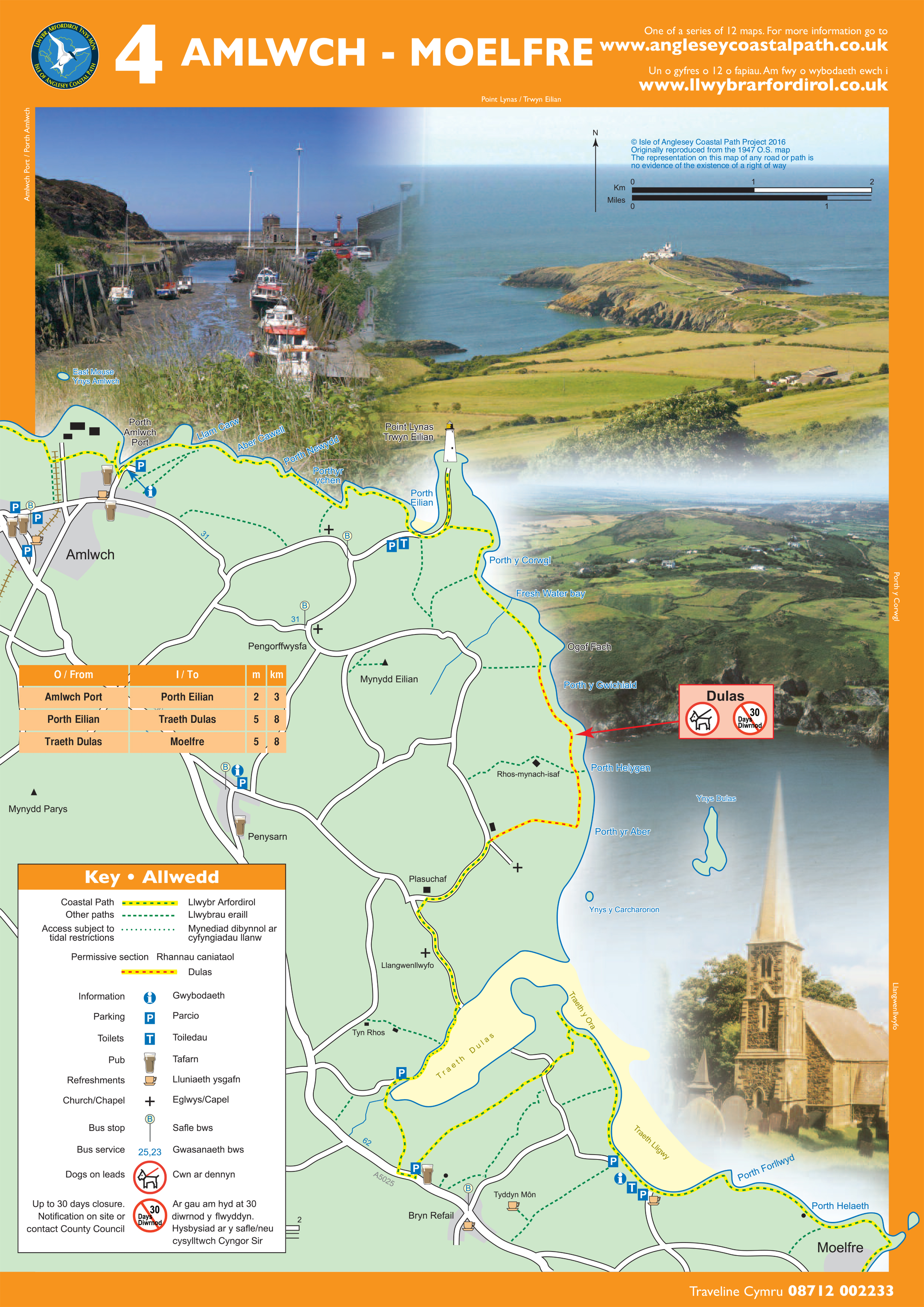 Croeswch gefn y traeth, i fynd ar lwybr ag wyneb arno. Ewch i’r dde, gan groesi lôn i ddilyn y llwybr hwn heibio Gorsaf y Bad Achub a Gwylfan Moelfre (‘Seawatch Centre’). Pasiwch hen orsaf y bad achub, heibio rhes o fythynnod, gan fynd i’r dde i ymuno â’r ffordd ym Mhorth Moelfre. Trowch i’r chwith ar hyd y lôn i gyrraedd glan y môr ym mhentref Moelfre.